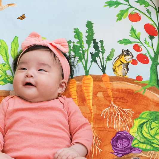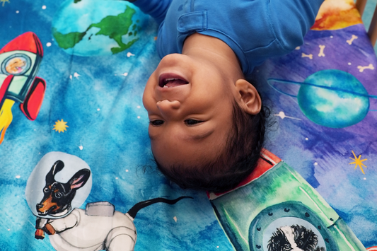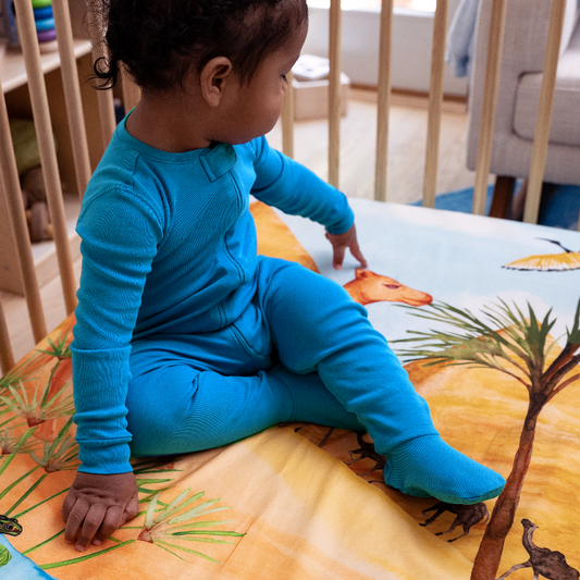 Unlike mass-produced sheets with generic patterns, each of our designs is hand-painted by our founder, bringing unique artistry to your nursery. The designs are thoughtfully crafted to grow with your child, from tummy time to first words